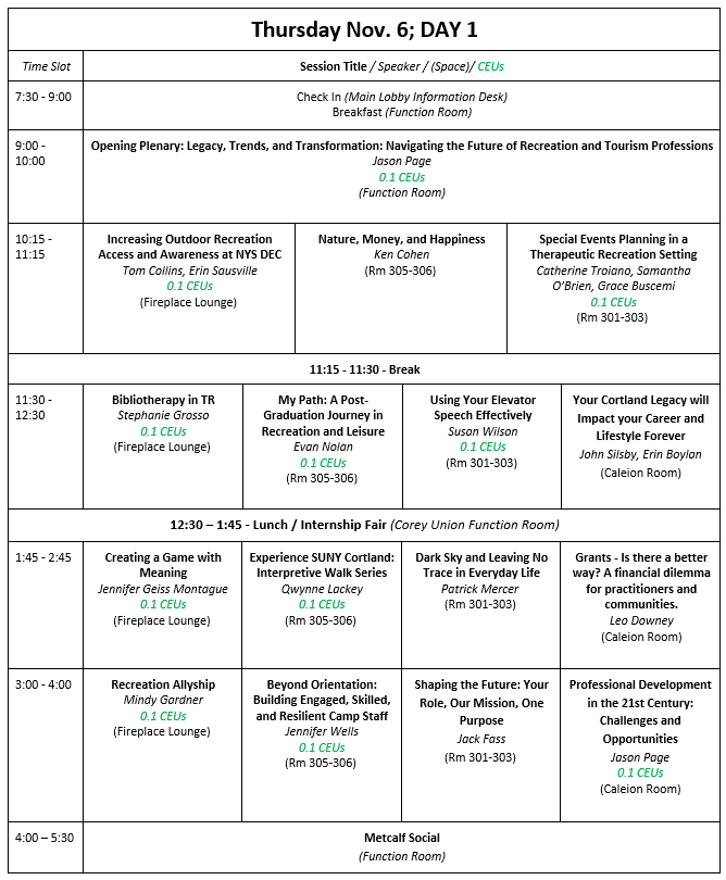 20 sessions have been pre- approved by NCTRC for the 75th Annual Cortland Recreation Conference, each offering 0.1 CEU’s (60 minutes). Three sessions have specialized designations: Geriatrics, Community Inclusion Services, and Behavioral Health.
