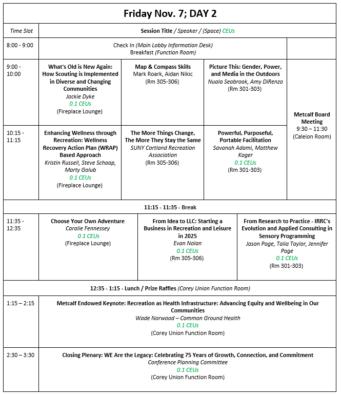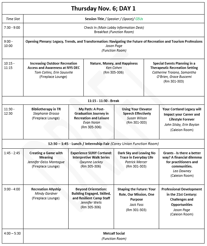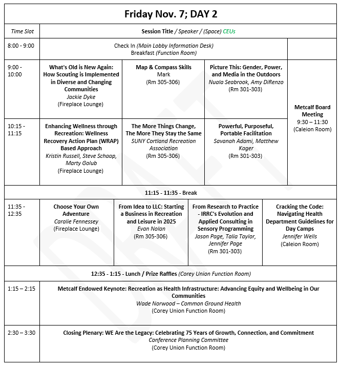 Please see the 75th Annual Recreation Conference’s Preliminary schedule below.